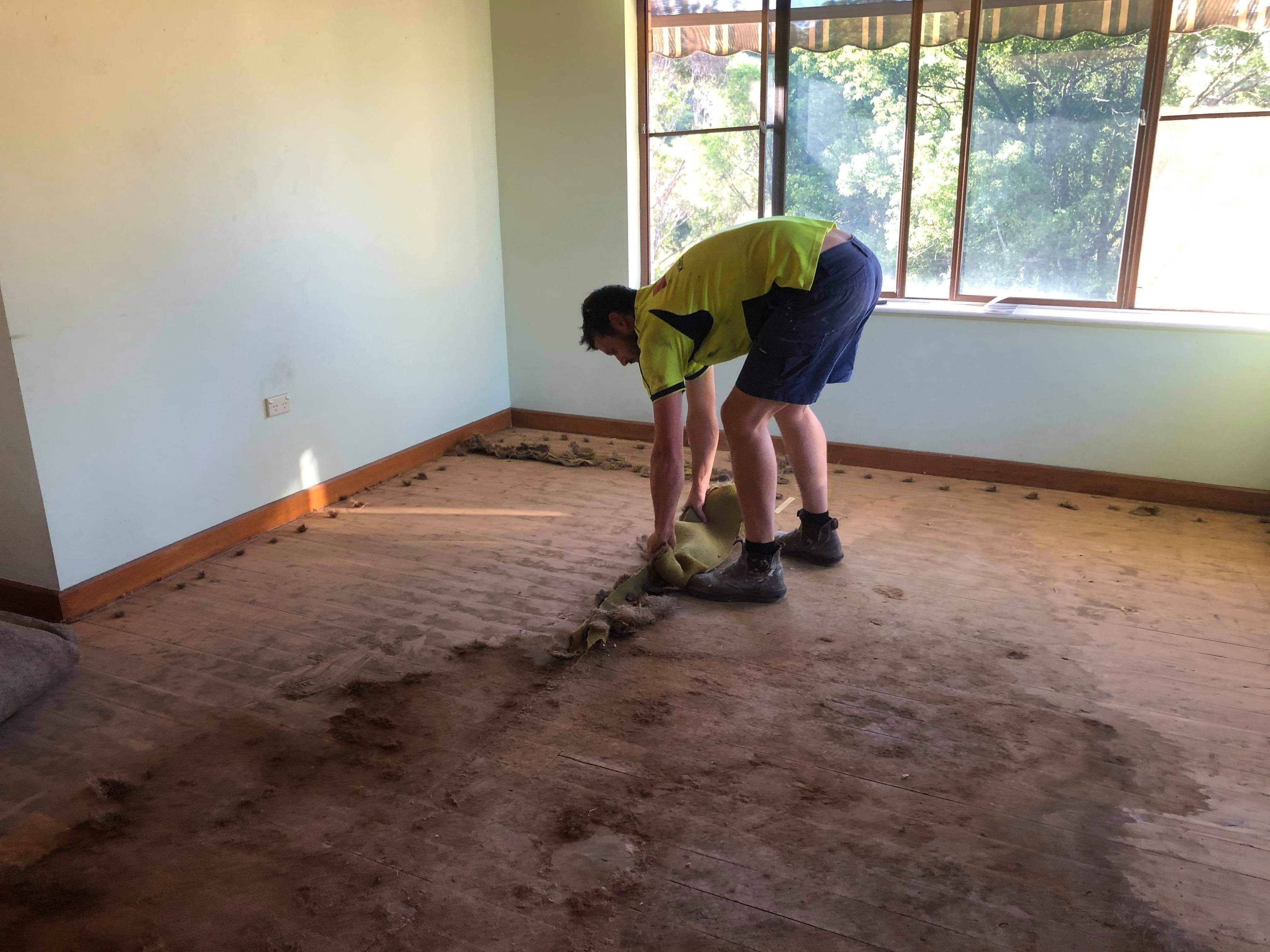 Pictured here removing old carpet in a lightning quick settlement day mini renovation!